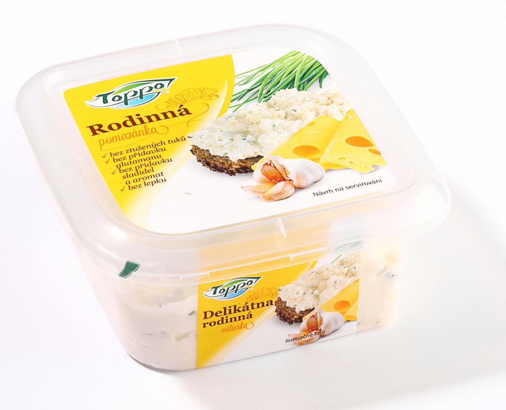 Toppo Rodinná nátierka je delikátnou kombináciou smotany, syra typu Ementál, cesnaku a najemno nakrájanej čerstvej pažítky. Môžeme ju podávať s bielym i tmavým pečivom a čerstvou zeleninou. Domáci i hostia v teplých dňoch ocenia vychladené plnené paradajky. Ako na to? Menším paradajkám odrežeme vrch, lyžicou ich zbavíme dužiny, naplníme nátierkou a vrch ozdobíme čerstvými bylinkami. Podávame na listovom šaláte. Cena: 0,79 € / 135 g, Lidl